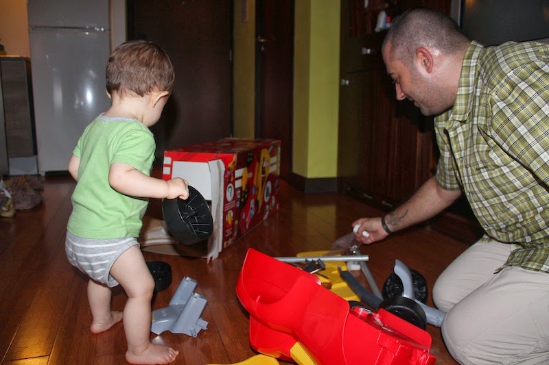 y’en a un qui aide son papa en déplaçant toutes sortes d’objets…