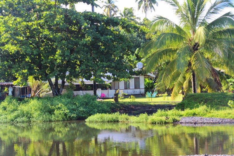 Nous arrivons dans la pension que nous avons réservé, sur les hauteurs de Teahupoo, avec une petite vue sur l’île de Tahiti nui (« nui » pour « grand » car ici nous sommes sur Tahiti iti : « petit »). Au bout d’un petit chemin qui monte… monte… monte, nous arrivons dans un endroit très bien aménagé, pelouse verte, jardin arboré et des bungalows cachés au milieu des arbres !!