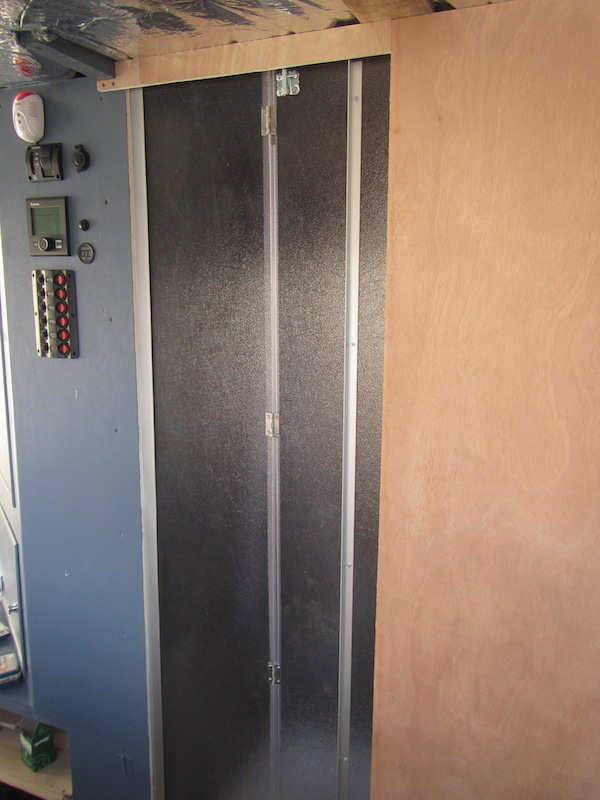 Ca y est, nous avons trouvé une solution pour fermer notre douche, une petite porte faite sur-mesure, pouvant se plier en deux pour s’ouvrir (ben oui, nous n’avons pas beaucoup de place!) et normalement hermétique!