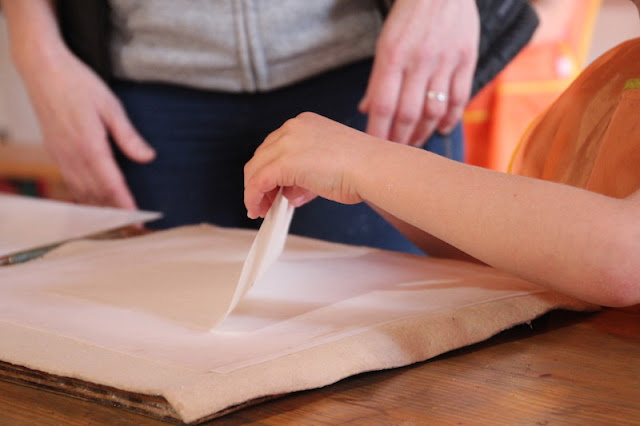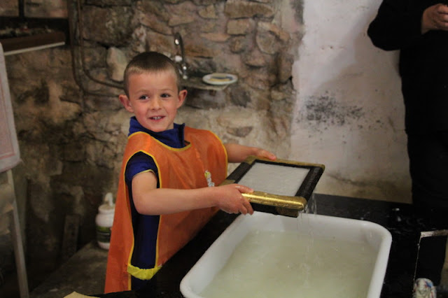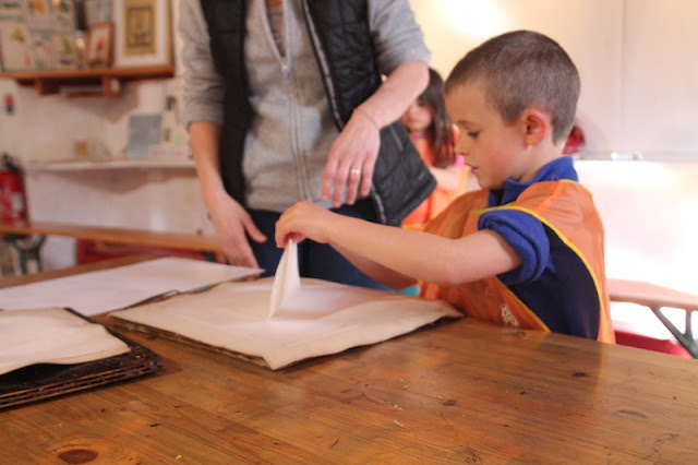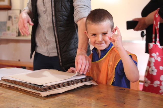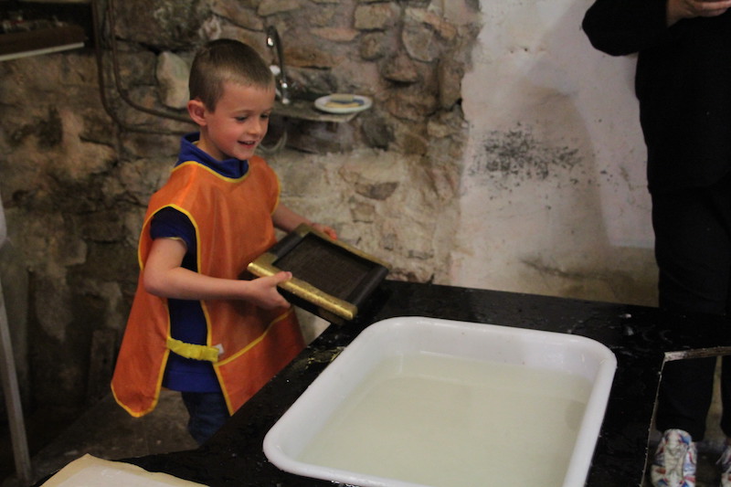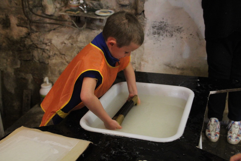Après, direction une grosse machine qui a appuyé sur le « tas de feuilles »… J’ai vu toute l’eau couler par terre…et enfin après avoir fait le pitre dernière étape, on décolle la feuille du tissu mouillé pour la mettre à sécher!
