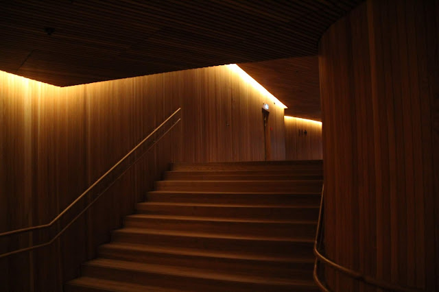 L’intérieur est comme un gros bloc en bois dans lequel les salles de spectacles sont construites. Ce matériau a essentiellement été choisi pour ses qualités acoustiques et ses possibilités de mise en forme pour que le son se propage correctement dans les salles même sans sonorisation. (l’entreprise qui a participé à l’élaboration des salles est la même que pour l’opéra de Sydney : Ave Arup.)