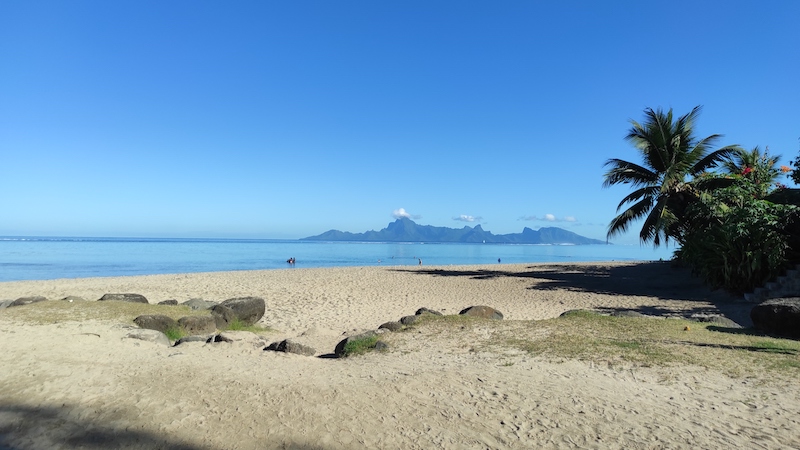 Pour ce premier tour de l’île, nous nous arrêtons au bout de 2 kms… 😊 au PK 18, une des plus belles plages de Tahiti, une grande plage de sable « blanc ». Il est tôt, le soleil ne cogne pas trop fort, nous en profitons pour faire une trempette! L’eau est à 30° et la vue sur l’île de Moorea est magnifique!…😀