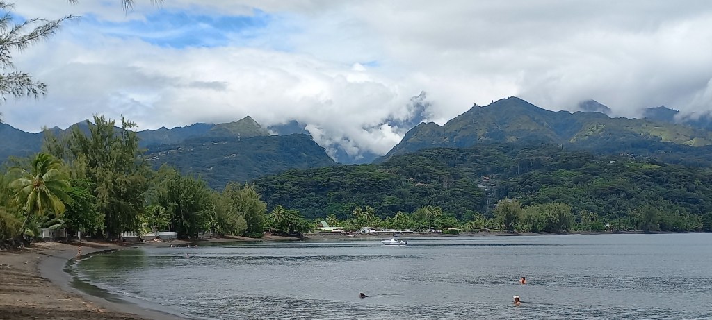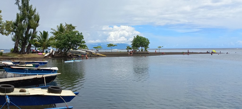 Un matin calme de vacances, petite pause à Mahina pour admirer le phare de la pointe Vénus et sa plage de sable noir…